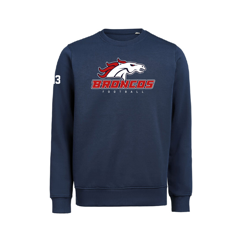 Hochwertiger Baumwoll Crewneck aus Biobaumwolle, bestickt mit dem Calanda Broncos Clublogo.
